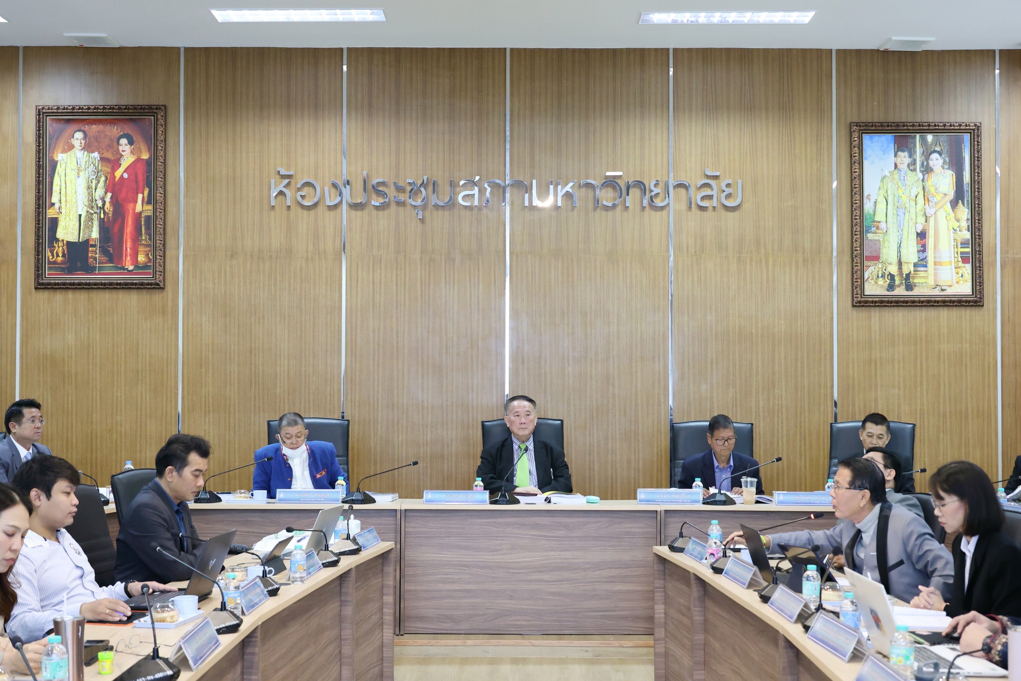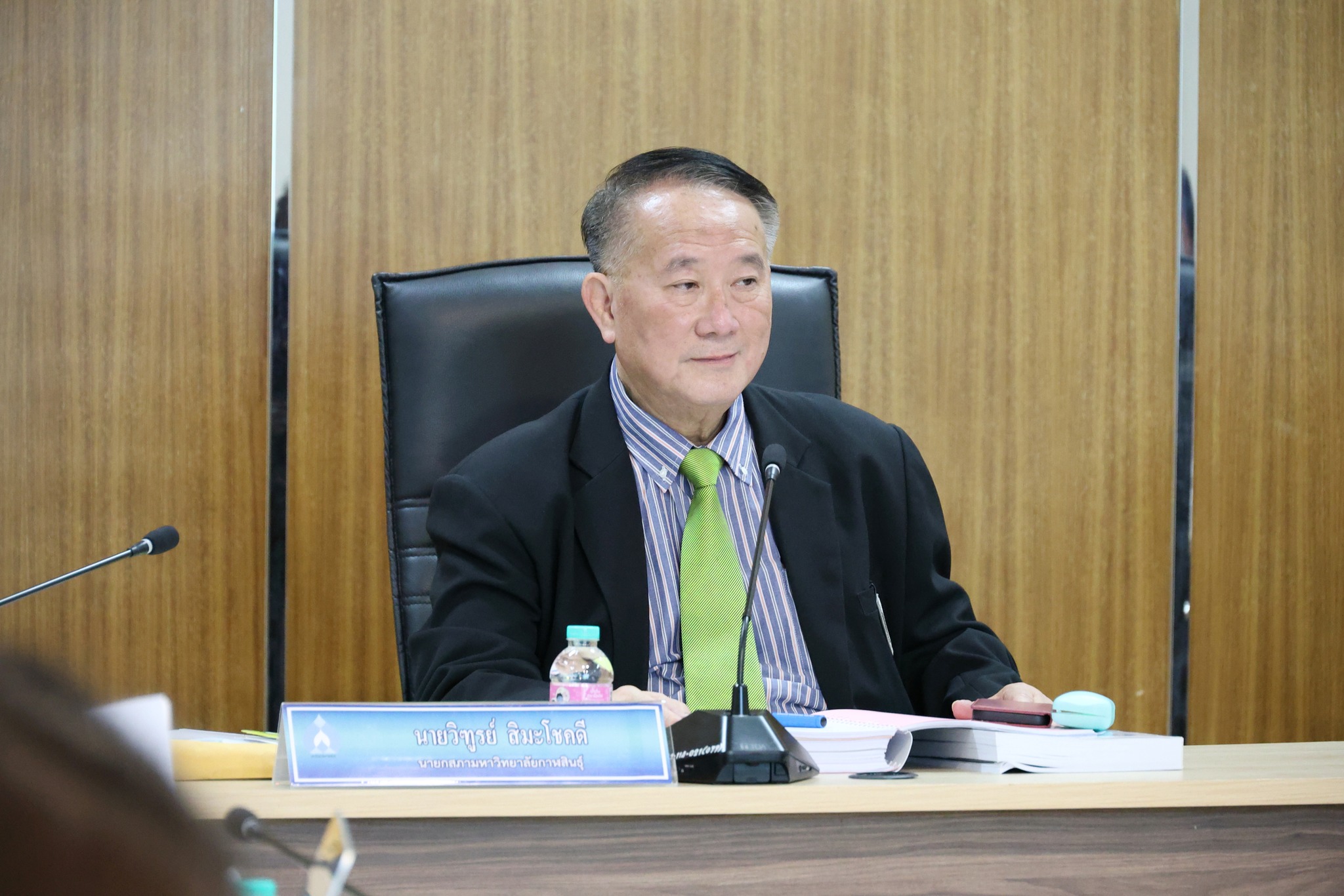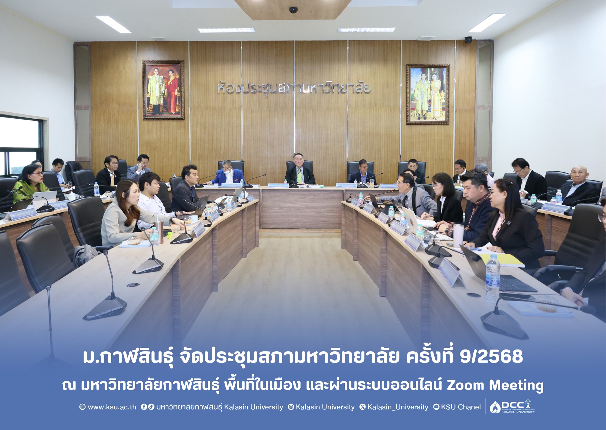 ซึ่งในการประชุมครั้งนี้ ได้มีมติในเรื่องสำคัญ ดังนี้ 1) กล่าวต้อนรับ และแสดงความยินดีกับกรรมการสภามหาวิทยาลัยจากคณาจารย์ประจำ และกรรมการสภามหาวิทยาลัยจากข้าราชการและพนักงานในสถาบันอุดมศึกษาที่มิใช่คณาจารย์ประจำ 2) พิจารณาระเบียบมหาวิทยาลัยกาฬสินธุ์ ว่าด้วย การยกเว้นค่าธรรมเนียมการศึกษาสำหรับอาจารย์ เพื่อศึกษาในหลักสูตรประกาศนียบัตรบัณฑิตชั้นสูง สาขาวิชานวตกรรมการจัดการเรียนรู้ (หลักสูตรใหม่ พ.ศ. 2568) มหาวิทยาลัยกาฬสินธุ์ พ.ศ. 2568 3) พิจารณาประกาศมหาวิทยาลัยกาฬสินธุ์ เรื่อง อัตราการเก็บค่าธรรมเนียมการศึกษาของนักศึกษาระดับประกาศนียบัตรบัณฑิต หลักสูตรประกาศนียบัตรบัณฑิต สาขาวิชานวัตกรรมการจัดการเรียนรู้ ภาคพิเศษ 4) มหาวิทยาลัยกาฬสินธุ์ เรื่อง อัตราการเก็บค่าธรรมเนียมการศึกษาของนักศึกษาระดับประกาศนียบัตรบัณฑิตชั้นสูง หลักสูตรประกาศนียบัตรบัณฑิตชั้นสูง สาขาวิชานวัตกรรมการจัดการเรียนรู้ ภาคพิเศษ 5) พิจารณาประกาศมหาวิทยาลัยกาฬสินธุ์ เรื่อง หลักเกณฑ์การเบิกจ่ายเงินเพื่อการจัดการศึกษา ระดับประกาศนียบัตรบัณฑิต ภาคพิเศษ 6) พิจารณาประกาศมหาวิทยาลัยกาฬสินธุ์ เรื่อง เกณฑ์การเบิกจ่ายเงินเพื่อการจัดการศึกษา ระดับประกาศนียบัตรบัณฑิตชั้นสูง ภาคพิเศษ 7) พิจารณาประกาศมหาวิทยาลัยกาฬสินธุ์ เรื่อง กำหนด ค่าธรรมเนียมการพัฒนาทักษะภาษาอังกฤษของนักศึกษา สำหรับนักศึกษาระดับปริญญาตรีและระดับประกาศนียบัตรขั้นสูง (ปวส.) พิจารณาประกาศคณะกรรมการประเมินผลการปฏิบัติหน้าที่ของคณบดีคณะเทคโนโลยีการเกษตร เรื่อง หลักเกณฑ์ วิธีการ และตัวชี้วัด การประเมินผลการปฏิบัติหน้าที่ของคณบดีคณะเทคโนโลยีการเกษตร 9) พิจารณาประกาศคณะกรรมการประเมินผลการปฏิบัติหน้าที่ของคณบดีคณะบริหารศาสตร์ เรื่อง หลักเกณฑ์ วิธีการ และตัวชี้วัด การประเมินผลการปฏิบัติหน้าที่ของคณบดีคณะบริหารศาสตร์ 10) พิจารณาประกาศคณะกรรมการประเมินผลการปฏิบัติหน้าที่ของคณบดีคณะศิลปศาสตร์ เรื่อง หลักเกณฑ์ วิธีการ และตัวชี้วัด การประเมินผลการปฏิบัติหน้าที่ของคณบดีคณะศิลปศาสตร์